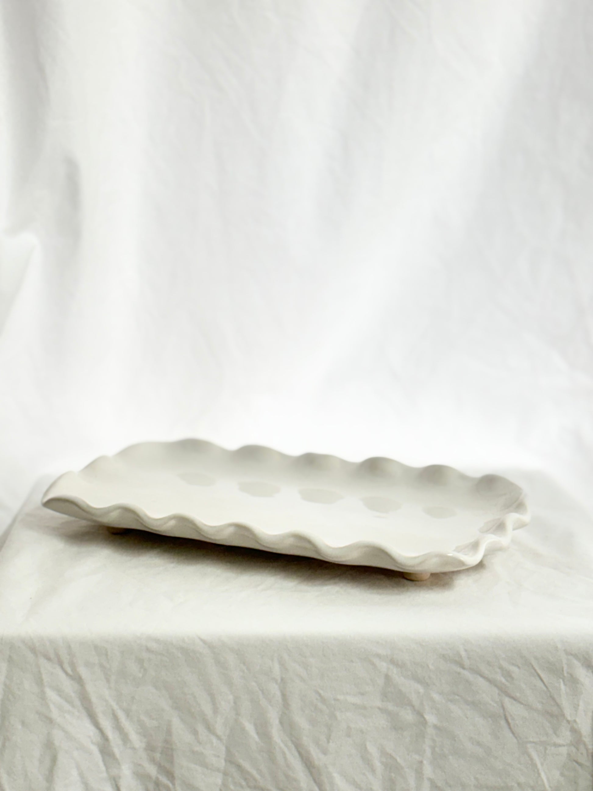 Introducing our hand crafted ruffle edged tray, the perfect addition to your kitchen or bathroom. Made with care and attention to detail, this tray adds a touch of elegance and functionality to any space. Use it to organize your toiletries or serve drinks and snacks with style.