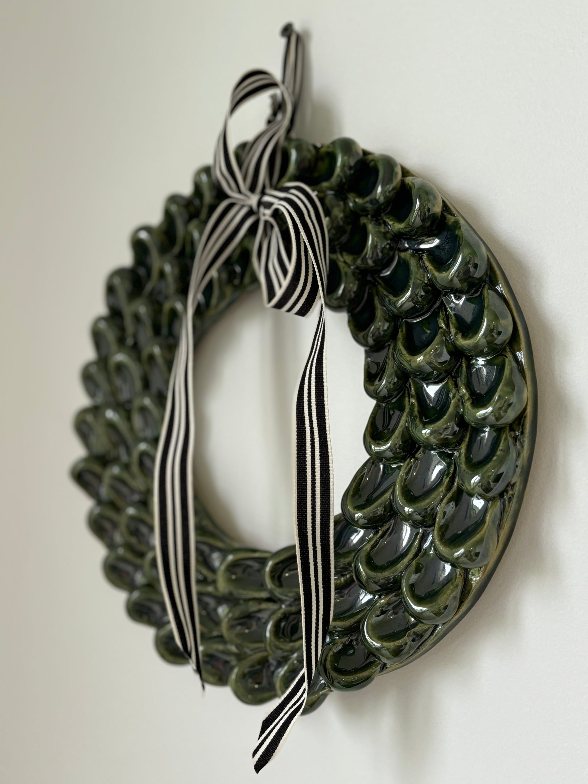 This Ceramic handmade Christmas wreath in a glassy green color adds a touch of elegance and traditional charm to your holiday decor. Each piece is carefully crafted, making it a unique and beautiful addition to your home. Get into the holiday spirit with this lovely wreath. Each wreath comes with a big velvet Brown ribbon