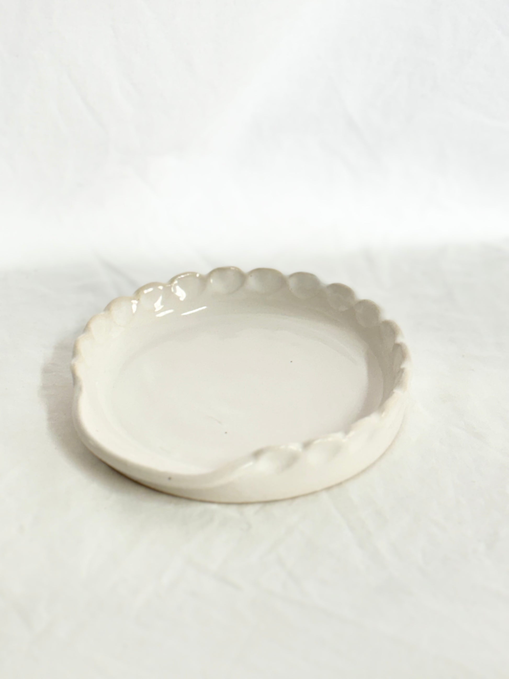 This wheel thrown spoon rest features an individually pinched rim for a unique and functional addition to your kitchen. Keep your countertops clean and organized while adding a touch of handmade charm to your cooking space. Crafted with expertise and precision, this spoon rest is a must-have for any culinary expert.